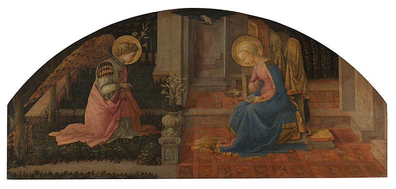 The picture comes from a palace belonging to the Medici, Florence’s ruling family at the time, where it most probably hung above a door. Below the central urn containing lilies, a symbol of Mary’s purity, is a carving of three feathers inside a diamond ring. This was an emblem adopted by several members of the Medici family.